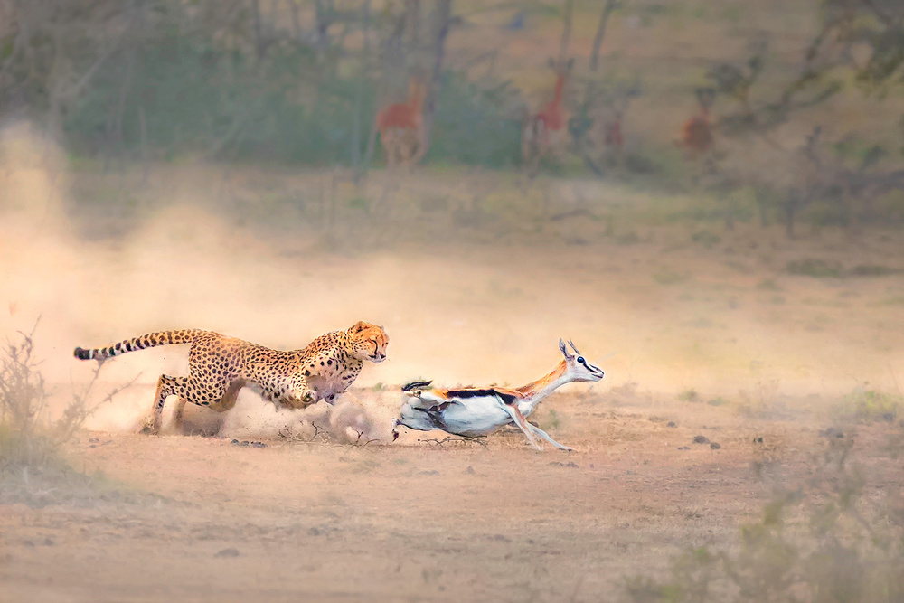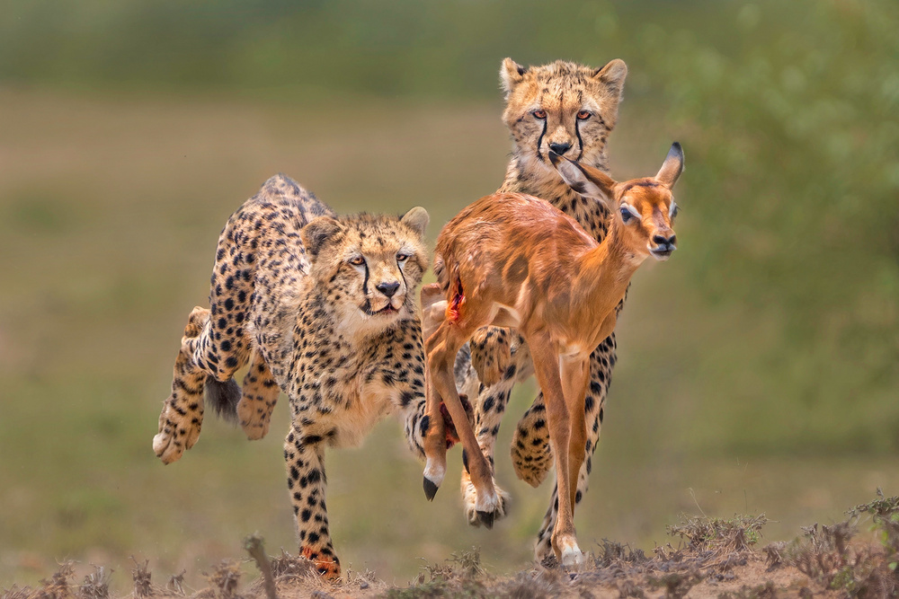 No Escape” was taken in Masai Mara National Reserve, Kenya in February 2015. The image shows two cheetah cubs trying to catch a wounded young impala. These are 2 of the 4 cubs of a cheetah name Malaika who I have been following for two years. They were about 7 months old then. Very often, cheetahs will not kill a prey, but just corner them to let cubs practice their hunting skills, and this is one of those scenes. It is cruel but necessary because this is how cubs learn to hunt and survive when they grow up. The truth of the fact is that 1 in every 5 cheetah cubs will grow to become an adult. Their mortality rate is very high, and that is the reason in the 3000 square kilometres land of Masai Mara, there are only 31 cheetahs. It is the most concentrated wild cheetah population in the world.