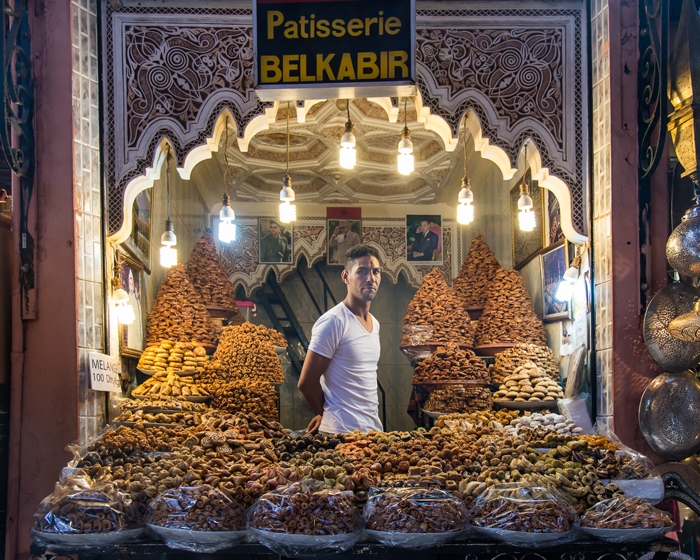 For street photography, I try to avoid long telephoto lenses because there’s no engagement with the subject, though in the photographer unfriendly environment of the medina, it was tempting. In the narrow streets, a wide angle setting was often used which kept everything in focus and helped to include people without obviously pointing the camera in their direction. Sometimes, I asked to take a storekeeper’s picture and about 50% of the time they agreed. Buying something from the store such as a bag of nuts increased the chance of success. In general though, setting exposure in advance, positioning and waiting for the right composition and then working at speed and moving quickly on worked best.