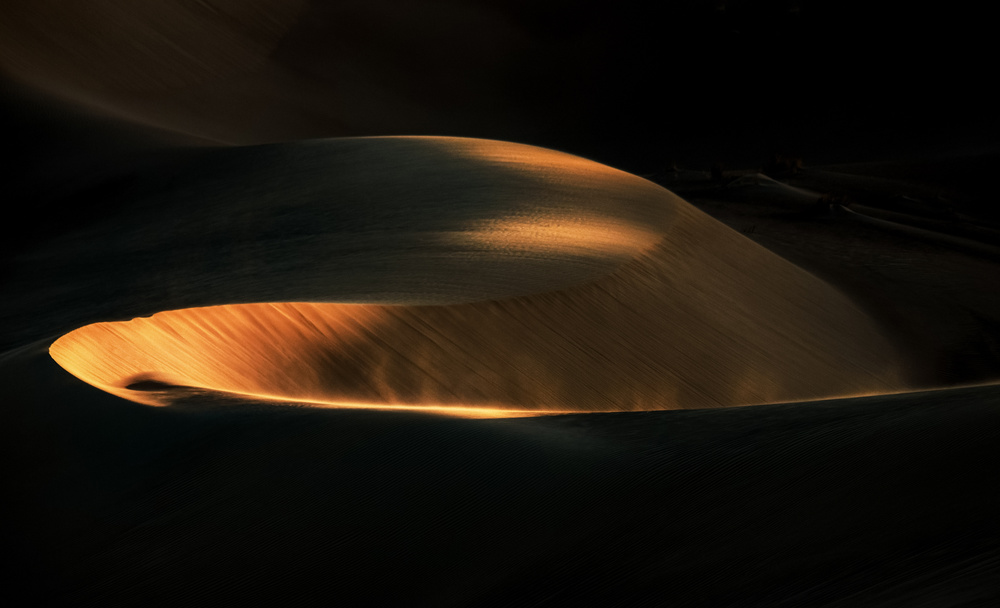 Conversely, in this image, the story is all about that line: what is it and what formed it with just sufficient illuminated areas to show that it is a wind-blown desert scene, explained with the sand blowing up in the foreground and the neat lines down the slope all pointing in the same direction.