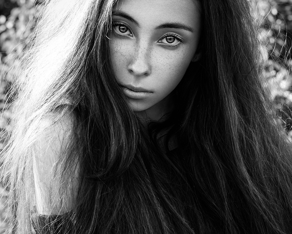 Where there is little background or context to the portrait, the story must come from the implied character of the subject. The little background that we can see, combined with the strong directional light indicates an outdoor setting, though the photographer has used even flat lighting for the face as shown by the extended catchlights in the eyes resulting in few shadows. The extreme crop across the top of the head focusses attention on the eyes which are staring directly at the photographer: challenging and independent in spirit. The unruly hair which frames the face adds to the story that this girl won’t be easily led.