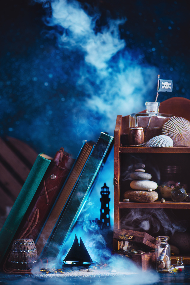 When all items are ready it's usually doesn't take long to make a composition (which I've already thought over at the first stage), set the lights and make a shot. Sometimes there may be difficulties with naughty sheets of paper or capricious smoke, so this stage can last from 1 to 4 hours.